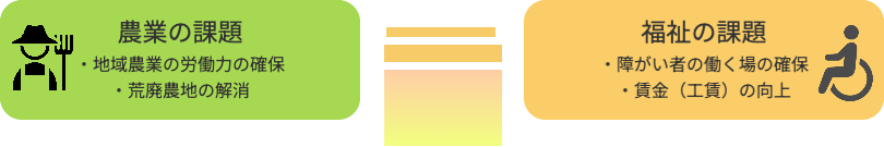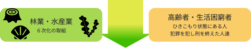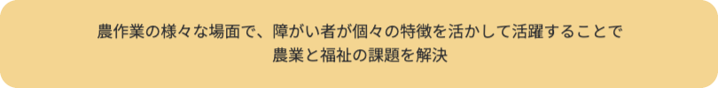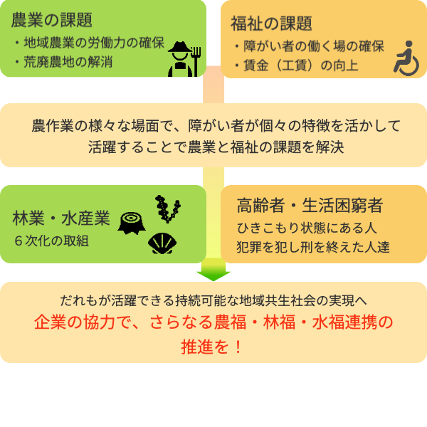 農林水福連携とは、農業×福祉、林業×福祉、水産業×福祉の連携で、障がい者の各分野での活躍を通じて経営の発展とともに、障がい者の自信や生きがいを創出し、社会参画を実現する取り組みです。